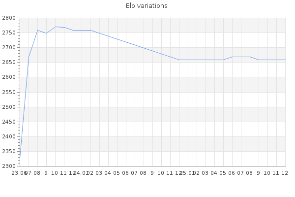 Elo no rounded:2657.7 Rd ( Small rd indicates a reliable elo ) : 152 Elo max :2770 Elo max this year :2770 Moves played :155 Country:Poland
