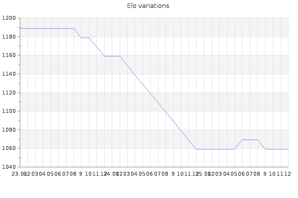 Elo no rounded:1058.6 Rd ( Small rd indicates a reliable elo ) : 203 Elo max :2000 Elo max this year :2000 Moves played :5302 Country:Brazil