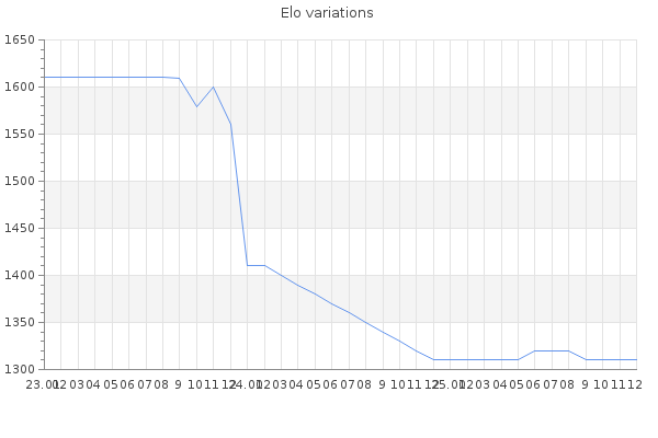 Elo no rounded:1313.3 Rd ( Small rd indicates a reliable elo ) : 111 Elo max :1890 Elo max this year :1890 Moves played :4190 Country:Poland