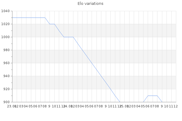 Elo no rounded:904 Rd ( Small rd indicates a reliable elo ) : 85 Fast Elo :1569 Fast Rd : 175 Elo max :1420 Elo max this year :1420 Moves played :1161 Country:Portugal