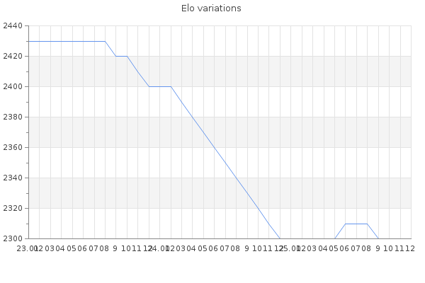 Elo no rounded:2299 Rd ( Small rd indicates a reliable elo ) : 119 Fast Elo :1959 Fast Rd : 192 Elo max :2610 Elo max this year :2610 Moves played :435 Country:Bulgaria