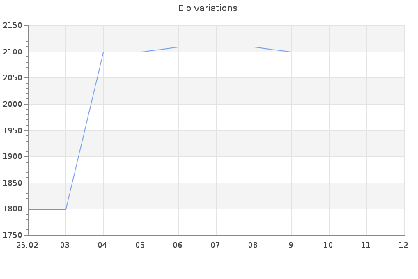 Elo no rounded:2100.6 Rd ( Small rd indicates a reliable elo ) : 338 Elo max :0 Elo max this year :0 Moves played :43 Country:Russia