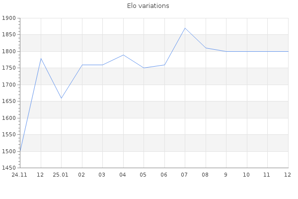 Elo no rounded:1802.4 Rd ( Small rd indicates a reliable elo ) : 119 Elo max :1870 Elo max this year :1870 Moves played :307 Country:Bulgaria