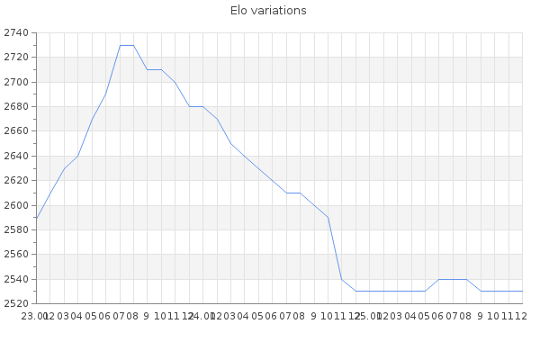 Elo no rounded:2525 Rd ( Small rd indicates a reliable elo ) : 121 Elo max :2860 Elo max this year :2860 Moves played :4479 Country:Azerbaijan