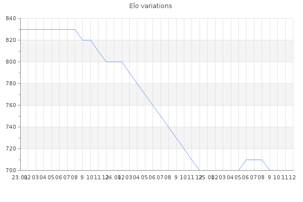 Elo no rounded:700.8 Rd ( Small rd indicates a reliable elo ) : 149 Elo max :1010 Elo max this year :1010 Moves played :61 Country:Indonesia