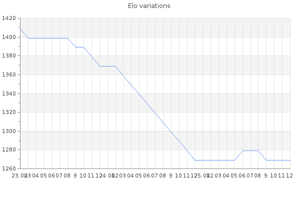 Elo no rounded:1267.5 Rd ( Small rd indicates a reliable elo ) : 165 Elo max :0 Elo max this year :0 Moves played :41 Country:other Country