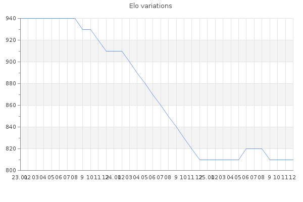 Elo no rounded:807.5 Rd ( Small rd indicates a reliable elo ) : 139 Fast Elo :1539 Fast Rd : 250 Elo max :1170 Elo max this year :1170 Moves played :84 Country:Philippines