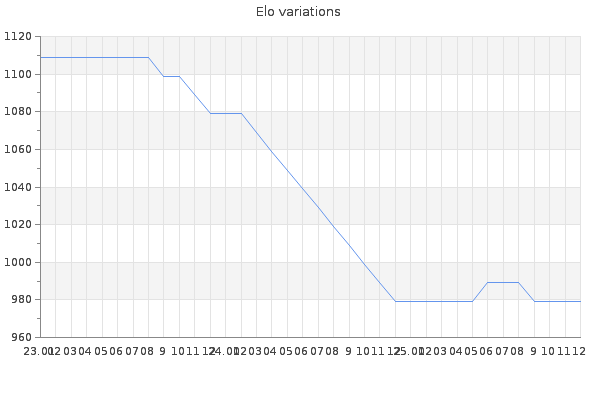 Elo no rounded:977.4 Rd ( Small rd indicates a reliable elo ) : 216 Elo max :0 Elo max this year :0 Moves played :16 Country:United Kingdom