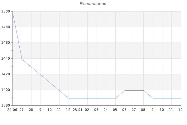 Elo no rounded:1392.3 Rd ( Small rd indicates a reliable elo ) : 162 Elo max :0 Elo max this year :0 Moves played :100 Country:Czech Republic
