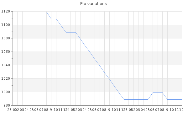 Elo no rounded:992.8 Rd ( Small rd indicates a reliable elo ) : 217 Elo max :0 Elo max this year :0 Moves played :75 Country:United States of America
