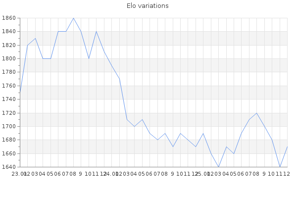Elo no rounded:1672.4 Rd ( Small rd indicates a reliable elo ) : 87 Fast Elo :1449 Fast Rd : 253 Elo max :2040 Elo max this year :2040 Moves played :17214 Country:Holy See (Vatican City)