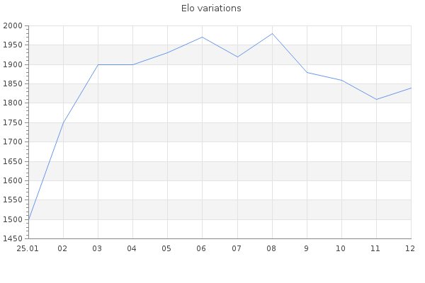 Elo no rounded:1840.7 Rd ( Small rd indicates a reliable elo ) : 97 Elo max :1980 Elo max this year :1980 Moves played :1010 Country:Australia