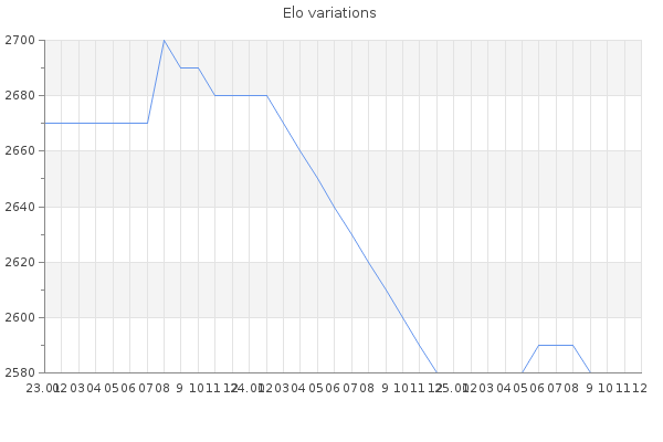 Elo no rounded:2577.1 Rd ( Small rd indicates a reliable elo ) : 123 Fast Elo :1789 Fast Rd : 256 Elo max :2860 Elo max this year :2860 Moves played :2894 Country:United States of America