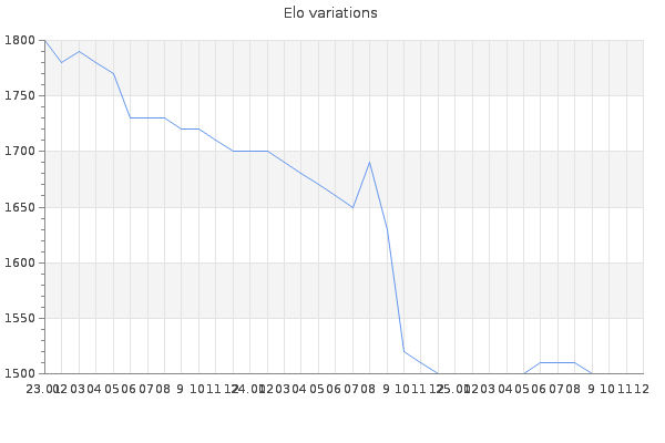 Elo no rounded:1503.8 Rd ( Small rd indicates a reliable elo ) : 119 Fast Elo :1790 Fast Rd : 95 Elo max :2240 Elo max this year :2240 Moves played :23745 Country:Italy