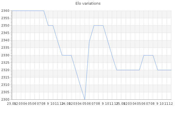 Elo no rounded:2320.4 Rd ( Small rd indicates a reliable elo ) : 127 Fast Elo :2180 Fast Rd : 131 Elo max :2540 Elo max this year :2540 Moves played :2292 Country:United States of America