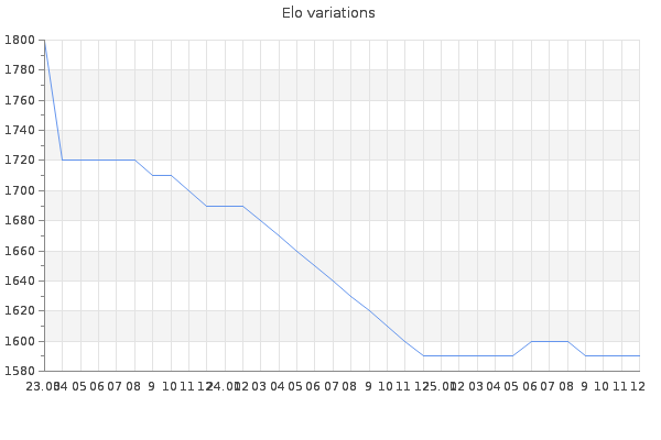 Elo no rounded:1585.7 Rd ( Small rd indicates a reliable elo ) : 141 Elo max :1720 Elo max this year :1720 Moves played :135 Country:Israel