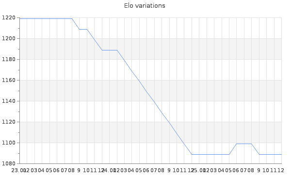 Elo no rounded:1085.4 Rd ( Small rd indicates a reliable elo ) : 176 Elo max :0 Elo max this year :0 Moves played :27 Country:Israel