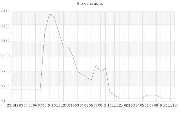 Elo no rounded:2163 Rd ( Small rd indicates a reliable elo ) : 92 Elo max :2630 Elo max this year :2630 Moves played :6241 Country:United Kingdom