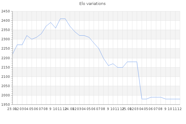 Elo no rounded:1984.9 Rd ( Small rd indicates a reliable elo ) : 80 Elo max :2420 Elo max this year :2420 Moves played :11422 Country:Canada