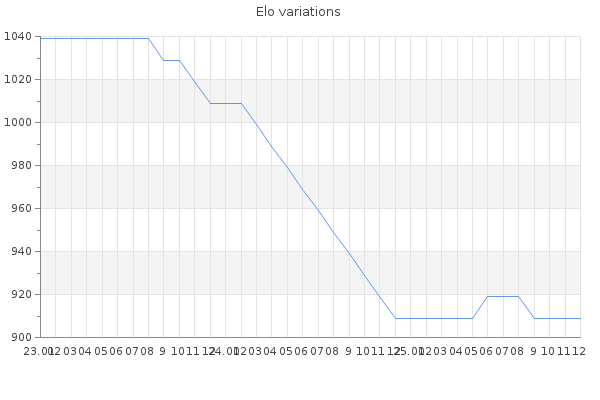 Elo no rounded:906.2 Rd ( Small rd indicates a reliable elo ) : 243 Elo max :0 Elo max this year :0 Moves played :9 Country:Nauru