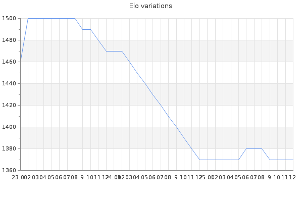 Elo no rounded:1365.8 Rd ( Small rd indicates a reliable elo ) : 114 Elo max :1500 Elo max this year :1500 Moves played :407 Country:Canada
