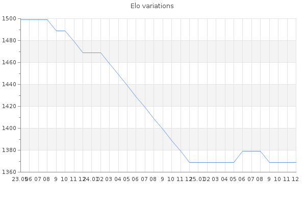 Elo no rounded:1369 Rd ( Small rd indicates a reliable elo ) : 350 Elo max :0 Elo max this year :0 Moves played :0 Country:United Kingdom