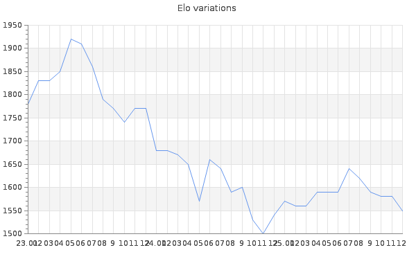 Elo no rounded:1554 Rd ( Small rd indicates a reliable elo ) : 99 Fast Elo :1329 Fast Rd : 265 Elo max :2280 Elo max this year :2280 Moves played :23542 Country:France