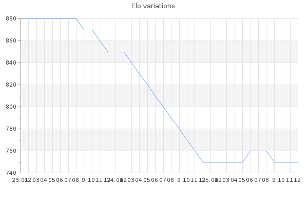 Elo no rounded:748.3 Rd ( Small rd indicates a reliable elo ) : 101 Elo max :1110 Elo max this year :1110 Moves played :689 Country:United States of America
