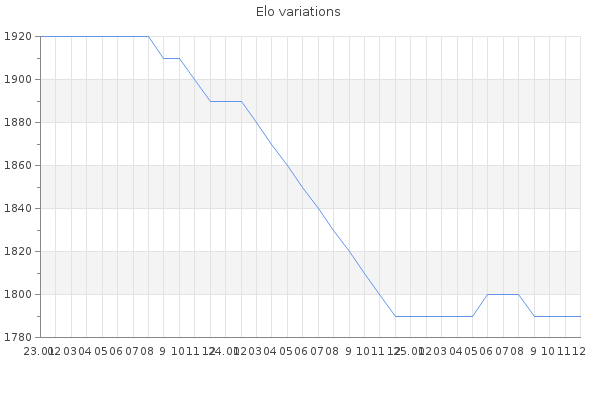 Elo no rounded:1787 Rd ( Small rd indicates a reliable elo ) : 109 Fast Elo :1639 Fast Rd : 314 Elo max :2160 Elo max this year :2160 Moves played :4143 Country:Bulgaria