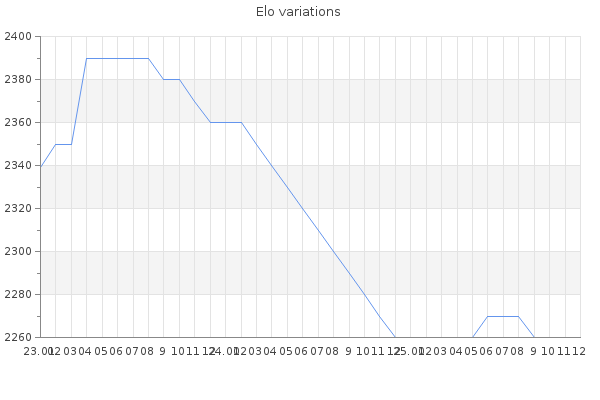 Elo no rounded:2256.3 Rd ( Small rd indicates a reliable elo ) : 123 Elo max :2390 Elo max this year :2390 Moves played :469 Country:United States of America
