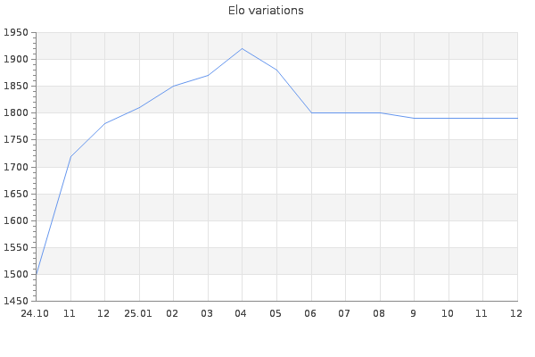 Elo no rounded:1787.4 Rd ( Small rd indicates a reliable elo ) : 87 Elo max :1920 Elo max this year :1920 Moves played :1427 Country:Malta