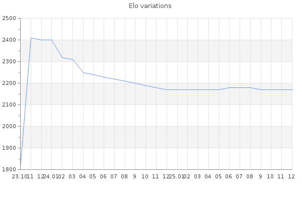 Elo no rounded:2164.5 Rd ( Small rd indicates a reliable elo ) : 198 Elo max :0 Elo max this year :0 Moves played :140 Country:San Marino