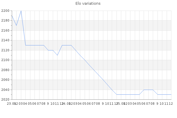 Elo no rounded:2033.2 Rd ( Small rd indicates a reliable elo ) : 128 Elo max :2590 Elo max this year :2590 Moves played :6419 Country:Argentina