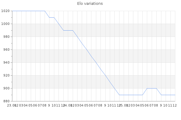 Elo no rounded:892.2 Rd ( Small rd indicates a reliable elo ) : 84 Elo max :1740 Elo max this year :1740 Moves played :1032 Country:Argentina