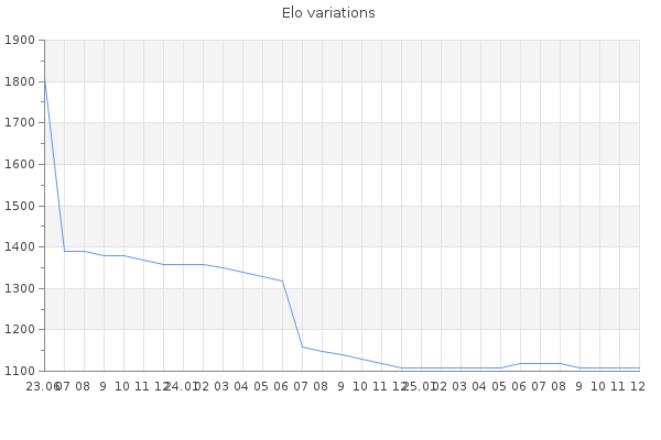 Elo no rounded:1106.4 Rd ( Small rd indicates a reliable elo ) : 165 Elo max :0 Elo max this year :0 Moves played :180 Country:Poland