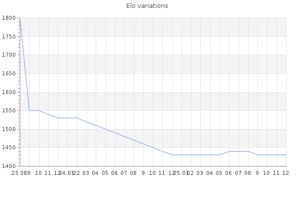 Elo no rounded:1427.6 Rd ( Small rd indicates a reliable elo ) : 144 Elo max :1570 Elo max this year :1570 Moves played :185 Country:Russia