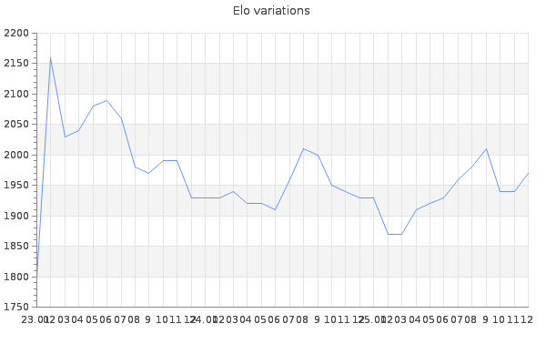 Elo no rounded:1966.7 Rd ( Small rd indicates a reliable elo ) : 92 Elo max :2180 Elo max this year :2180 Moves played :7090 Country:Trinidad and Tobago