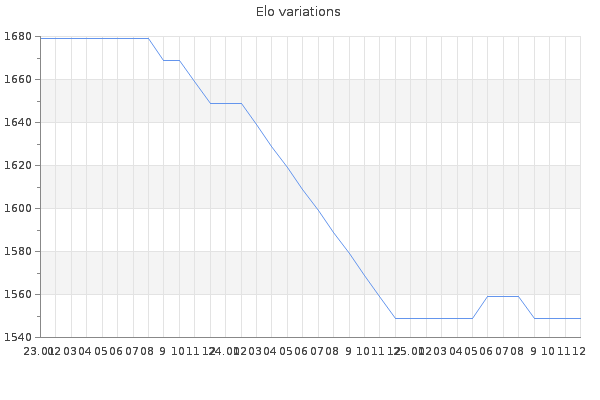 Elo no rounded:1552.1 Rd ( Small rd indicates a reliable elo ) : 156 Elo max :0 Elo max this year :0 Moves played :208 Country:Germany