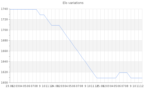 Elo no rounded:1607.6 Rd ( Small rd indicates a reliable elo ) : 150 Elo max :0 Elo max this year :0 Moves played :288 Country:United Kingdom