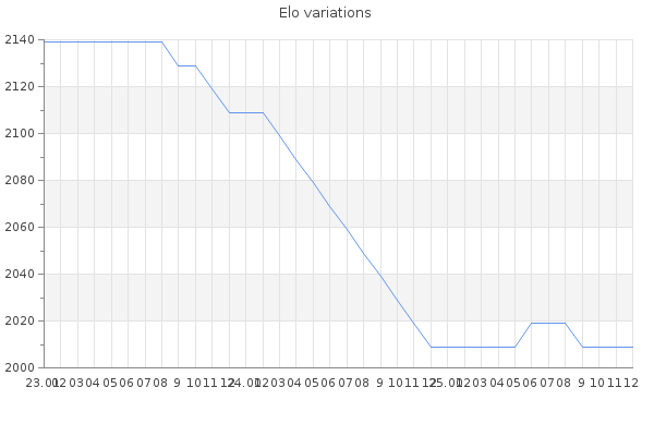 Elo no rounded:2009.5 Rd ( Small rd indicates a reliable elo ) : 167 Fast Elo :2029 Fast Rd : 155 Elo max :2370 Elo max this year :2370 Moves played :4832 Country:Canada