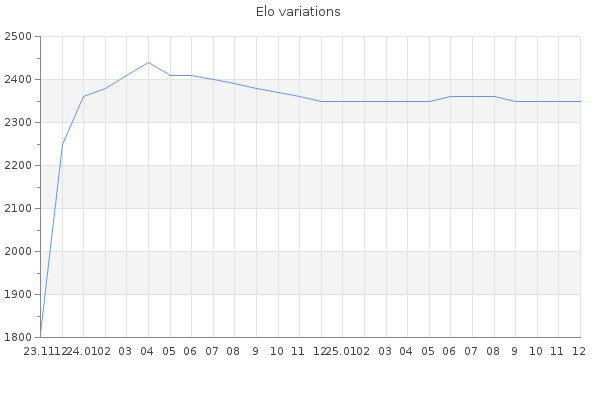Elo no rounded:2348.2 Rd ( Small rd indicates a reliable elo ) : 87 Elo max :2440 Elo max this year :2440 Moves played :1309 Country:Estonia