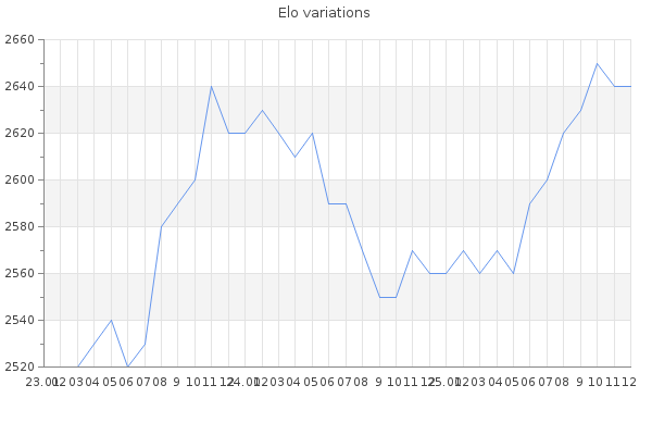 Remaining days of holidays :18 Elo no rounded:2637.1 Rd ( Small rd indicates a reliable elo ) : 80 Fast Elo :2279 Fast Rd : 248 Elo max :2810 Elo max this year :2810 Moves played :44254 Country:Sweden