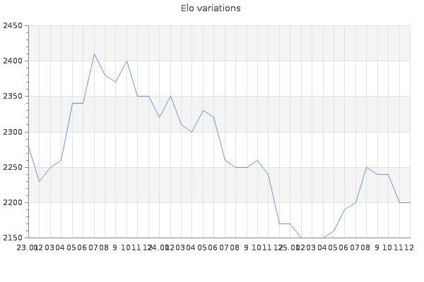 Elo no rounded:2204.2 Rd ( Small rd indicates a reliable elo ) : 109 Elo max :2680 Elo max this year :2680 Moves played :19842 Country:Argentina