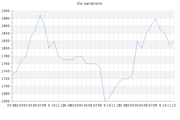 Elo no rounded:1818.5 Rd ( Small rd indicates a reliable elo ) : 104 Fast Elo :1379 Fast Rd : 251 Elo max :2080 Elo max this year :2080 Moves played :23856 Country:Spain