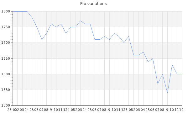 Elo no rounded:1602.2 Rd ( Small rd indicates a reliable elo ) : 90 Fast Elo :1789 Fast Rd : 251 Elo max :2170 Elo max this year :2170 Moves played :44833 Country:Italy