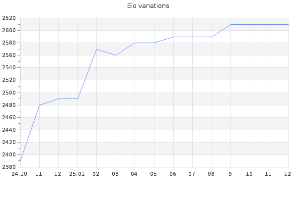 Elo no rounded:2608.9 Rd ( Small rd indicates a reliable elo ) : 101 Elo max :2620 Elo max this year :2620 Moves played :1188 Country:Philippines