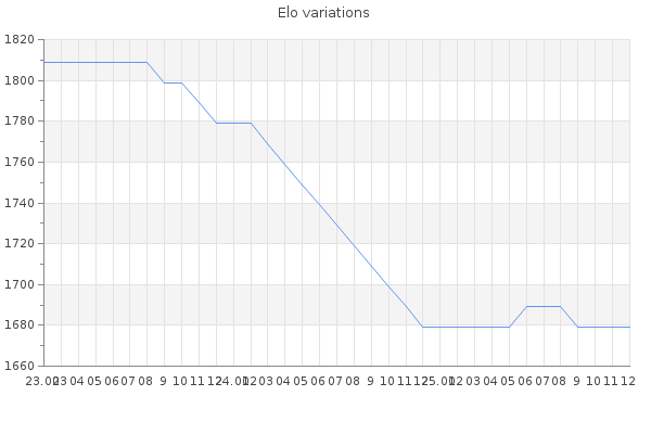 Elo no rounded:1679 Rd ( Small rd indicates a reliable elo ) : 350 Elo max :0 Elo max this year :0 Moves played :6 Country:Poland