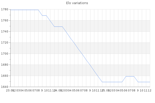 Elo no rounded:1650.7 Rd ( Small rd indicates a reliable elo ) : 160 Fast Elo :1819 Fast Rd : 261 Elo max :2560 Elo max this year :2560 Moves played :2912 Country:France