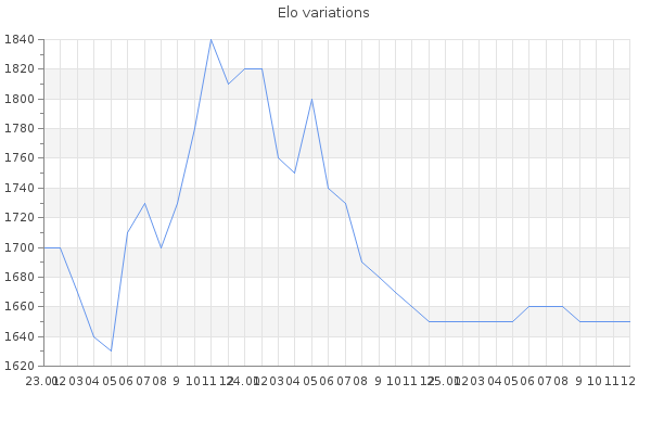 Elo no rounded:1650.8 Rd ( Small rd indicates a reliable elo ) : 83 Fast Elo :1489 Fast Rd : 275 Elo max :2160 Elo max this year :2160 Moves played :35694 Country:Spain