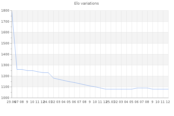 Elo no rounded:1082.9 Rd ( Small rd indicates a reliable elo ) : 123 Elo max :1410 Elo max this year :1410 Moves played :95 Country:Mexico